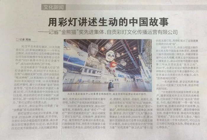 2020年11月,由該公司設計制作的4座大型中國皇家風格貢燈,亮相第三屆中國國際進口博覽會,并被國家會展中心永久收藏。在第五屆中國國際進口博覽會上,該公司所制作的彩燈連續(xù)第三年從自貢出發(fā)赴“東方之約”。2022年,由該公司設計制作的賽事吉祥物彩燈亮相北京冬奧會媒體中心,向世界展示自貢彩燈的藝術(shù)魅力,成為“世界級網(wǎng)紅燈組”。