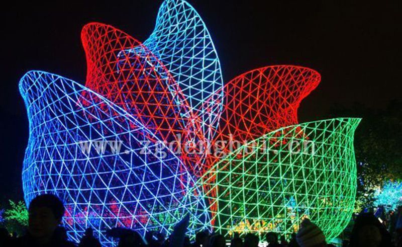 全新大型燈組《花開燈城》,是目前國內最大的整體LED主題燈組。燈組采用LED新光源技術,結合我市獨特的竹編新工藝,匠心獨具制作了一組巨大的藝術花卉主景燈,燈組制作土洋結合,工藝創(chuàng)新,觀賞度高。一流的工藝造型,一流的程序控制,一流的燈光效果,產(chǎn)生強烈的視覺沖擊力,高大18米的燈組似一顆巨大的夜明珠,在燈會中大放異彩。而在一號湖的大型水上燈《紅紅火火》,更是采取新工藝打造,燈組用手工編制了7千多只中國傳統(tǒng)大紅燈籠,組成8棵高達18米的巨大的燈籠樹,形成了動感十足、紅透半邊天的震撼效果。